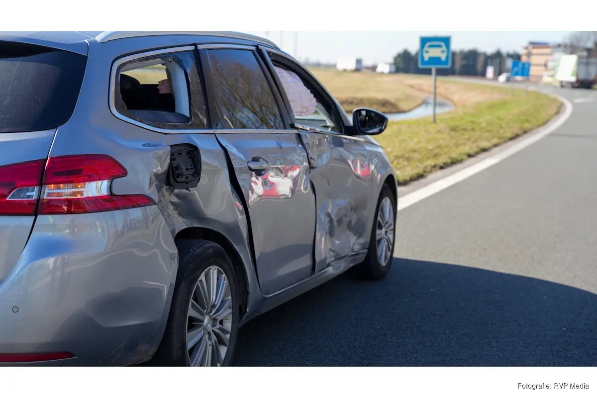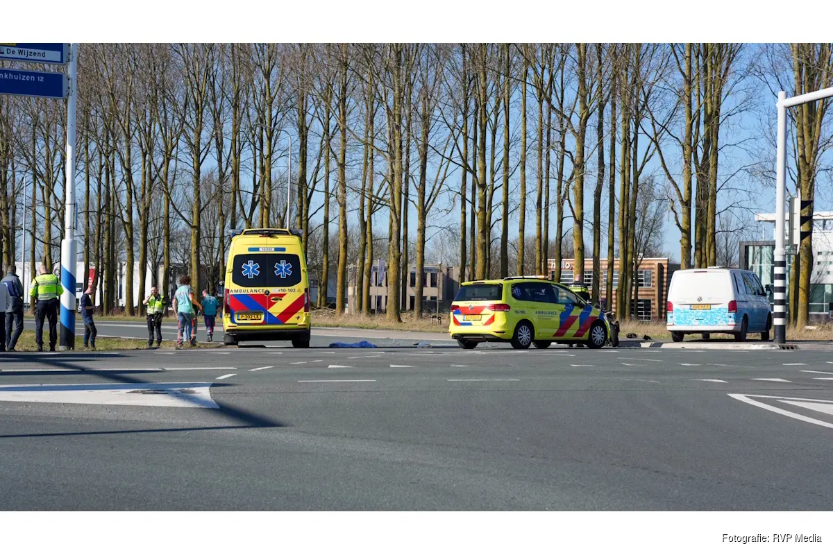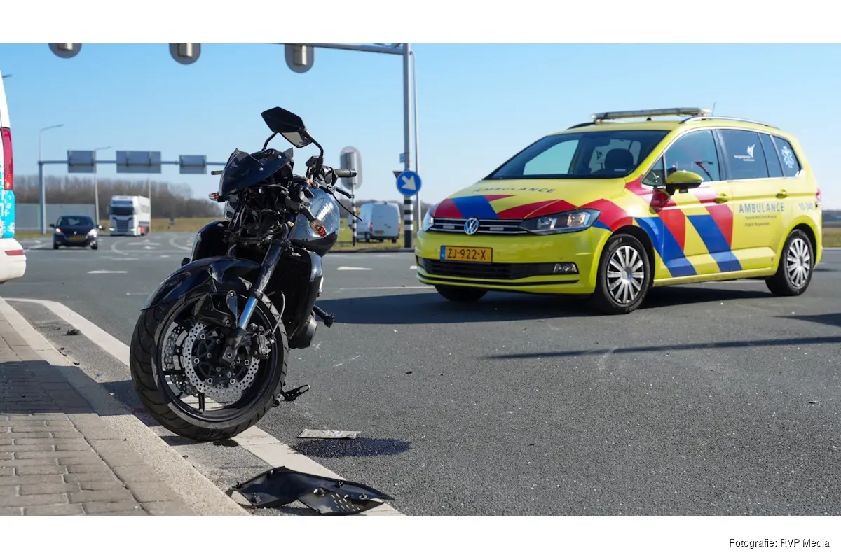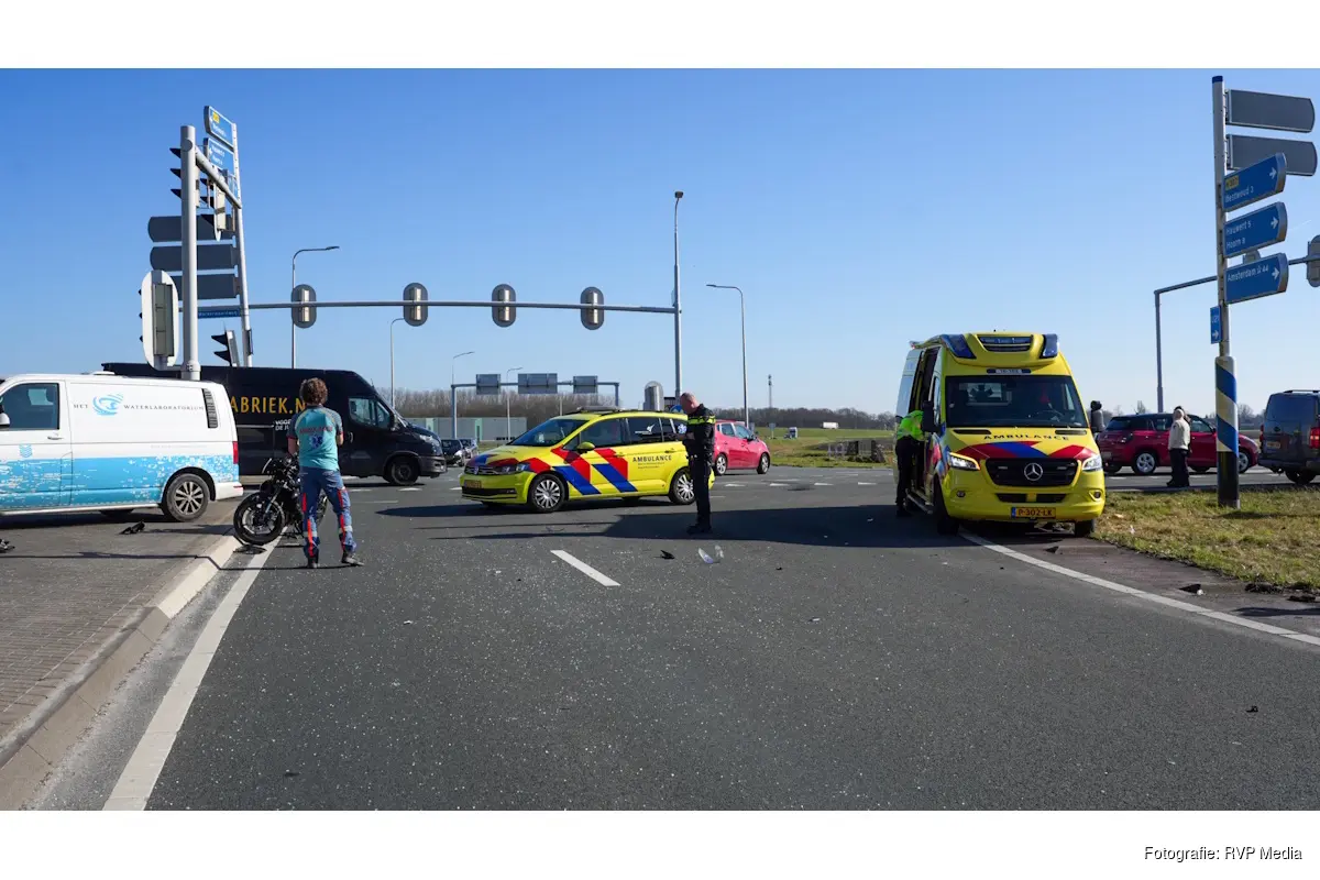 Op de kruising kwam een motorrijder in botsing met een personenauto. Daarbij reed de motorrijder tegen de zijkant van de auto en kwam vervolgens ten val.