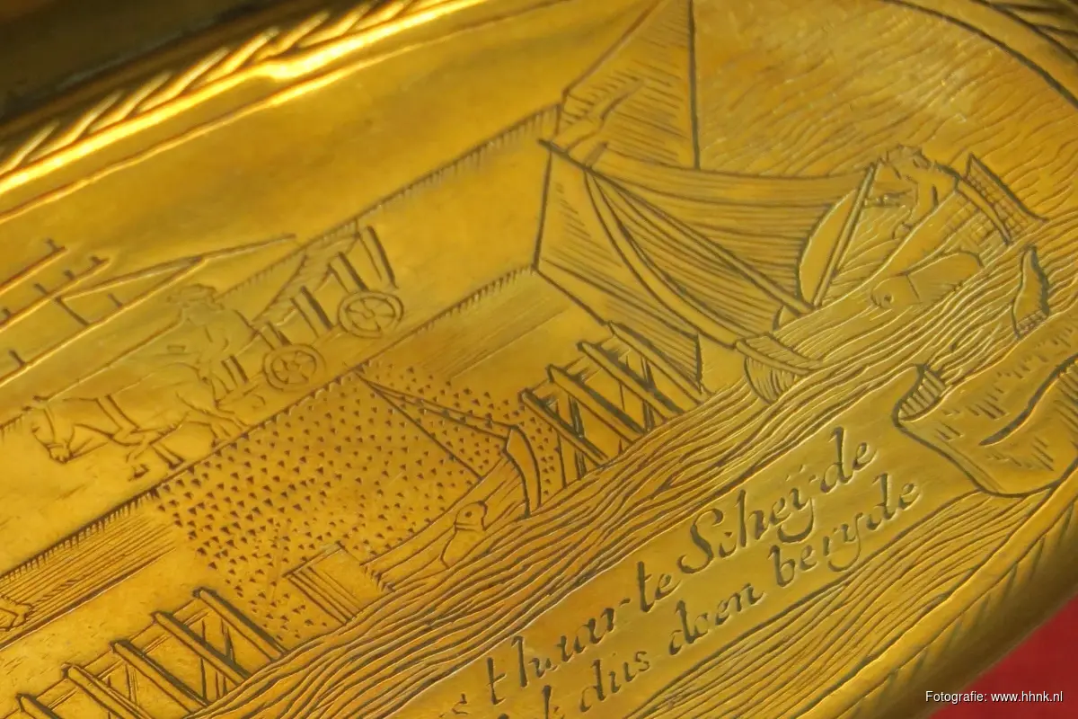 Deze tabaksdoos toont de herstelwerkzaamheden na een dijkdoorbraak. Het geeft een indruk van de mensen die gezamenlijk de schouders eronder zetten om het gat te dichten en het land weer bewoonbaar te maken. Oude scènes van dijkherstel en de mensen die hieraan werkten zijn uitzonderlijk; de tabaksdoos geeft dan ook een uniek inkijkje in de mensen die zich daarmee bezighielden. Op het deksel aan de voorzijde staan de goden Neptunes van de zee en Ceres van de landbouw afgebeeld naast een monogram van ineengevlochten letters.