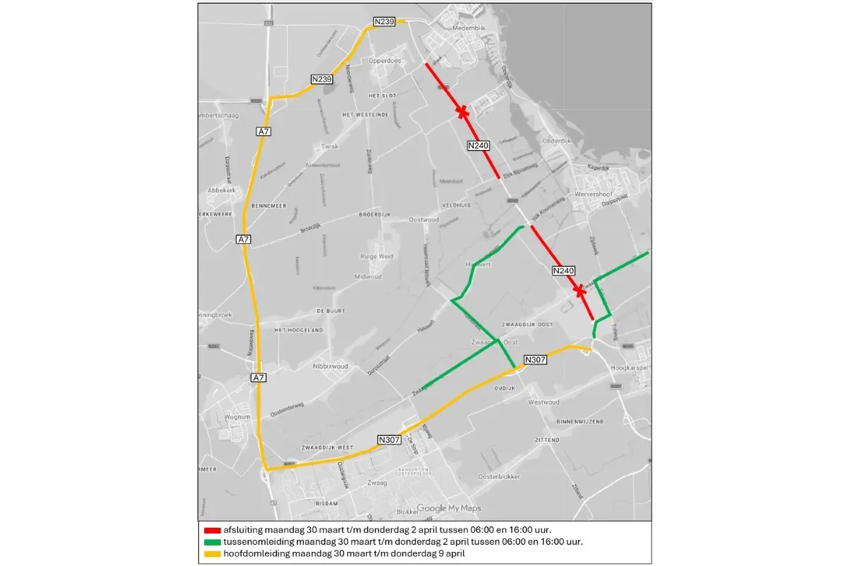 Van maandag 30 maart tot en met donderdag 2 april is de N240 tussen de rotonde met de Marktweg/ Zaadmarkt en de rotonde Vok Koomenweg dagelijks tussen 06.00 uur en 16.00 uur afgesloten voor doorgaand verkeer. In dezelfde periode is ook het traject N240 tussen de rotonde Dirk Bijvoetweg en de rotonde Almereweg volledig afgesloten. Het asfalt wordt vervangen en er wordt nieuwe belijning aangebracht. Het doorgaande verkeer volgt deze periode een omleiding via de N307 Westfriesiaweg, de A7 en de N239 Westerzeedijk. De parallelweg langs de N240 blijft beschikbaar voor nood- en hulpdiensten en langzaam verkeer.