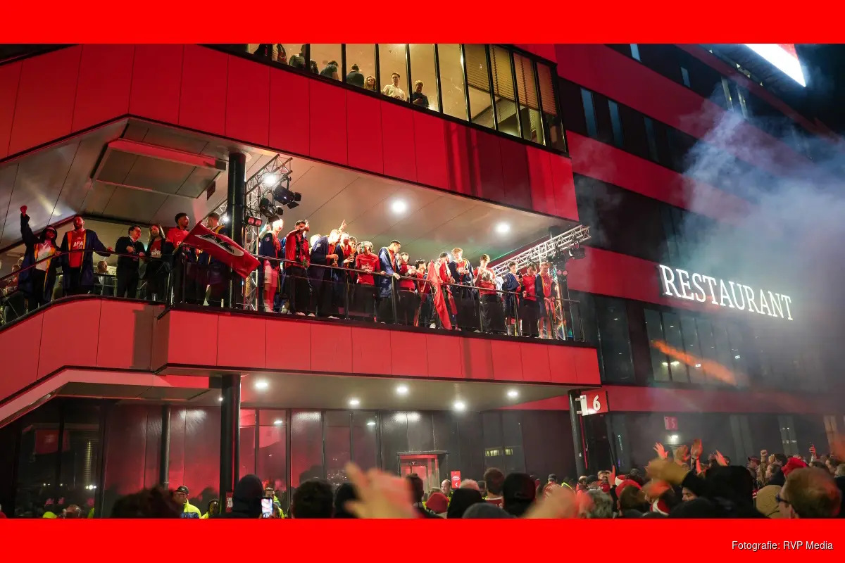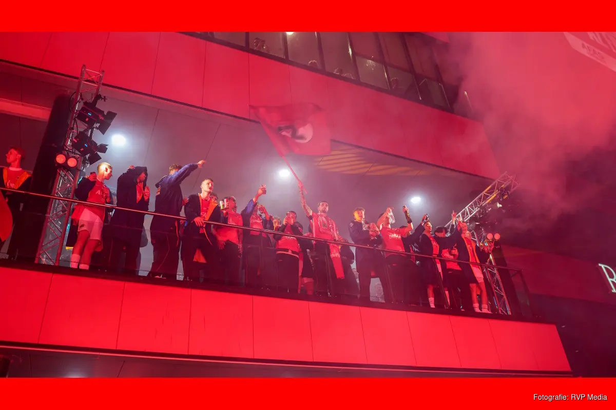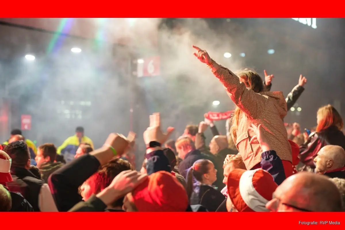 Bij het stadion stonden veel feestvierders te wachten tot de bus met daarin de spelers terug kwam vanuit Rotterdam.