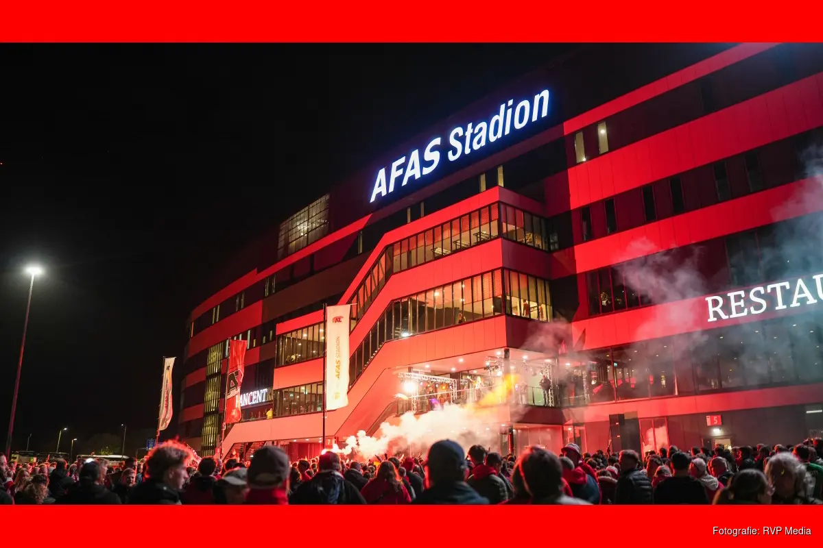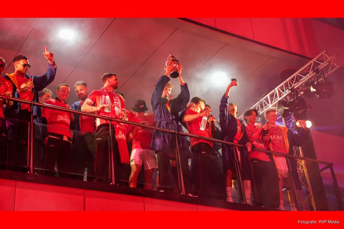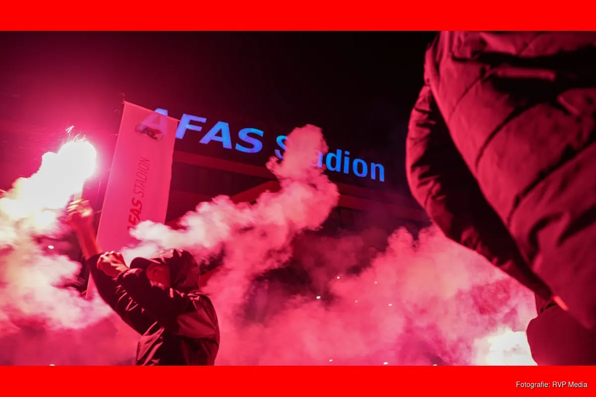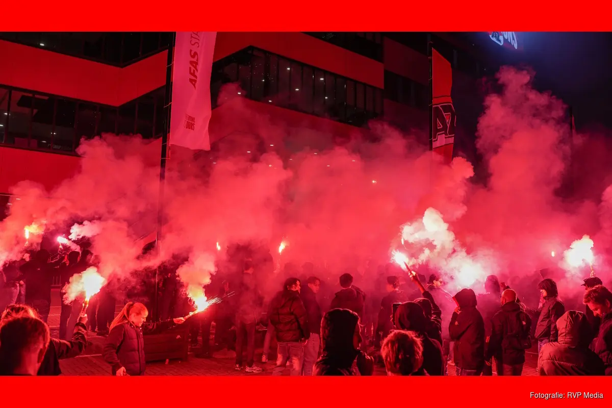 ALKMAAR - Duizenden AZ-supporters hebben zondagavond bij het AFAS-Stadion de spelersbus van AZ opgewacht na de winst van de KNVB-beker eerder die avond. AZ won de finale in De Kuip te Rotterdam door NEC met 5-1 te verslaan. Zondagavond laat kwam de spelersbus terug bij het eigen stadion waar een flinke menigte stond te wchten om nog een klein feestje te vieren.