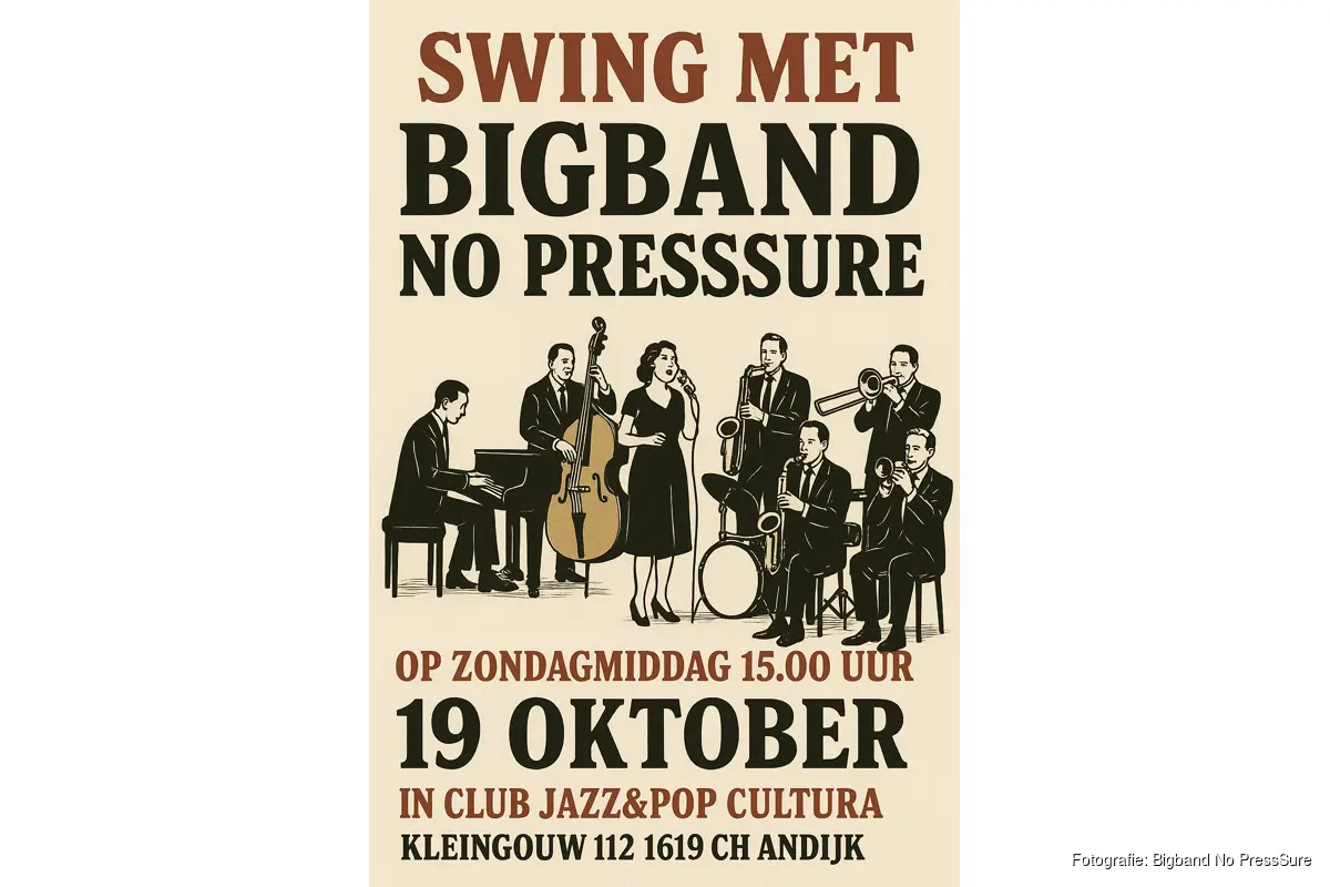 ANDIJK - Een optreden van een bigband is altijd iets bijzonders: levendige jazzklanken vullen de zaal, van krachtige blazers tot groovende drums en gitaren, en de warme sound van de saxofoons. No PressSure brengt een mix van klassiekers en moderne nummers in een swingende, jazzy stijl die niemand stil laat zitten.